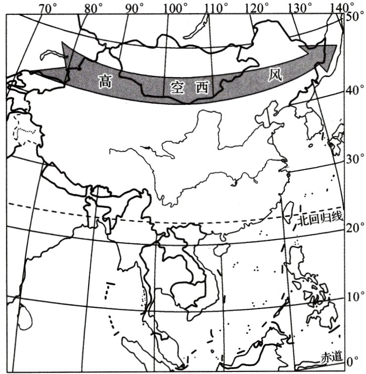 (2021·海南等级考)研究表明,中纬西风厚度从近地面可达对流层的上部,受海陆热力性质差异影响,近地面西风带会被破坏。下图示意亚洲部分地区某季节高空(海拔约5500米高度)西风的位置。据此完成(1)(2)题。