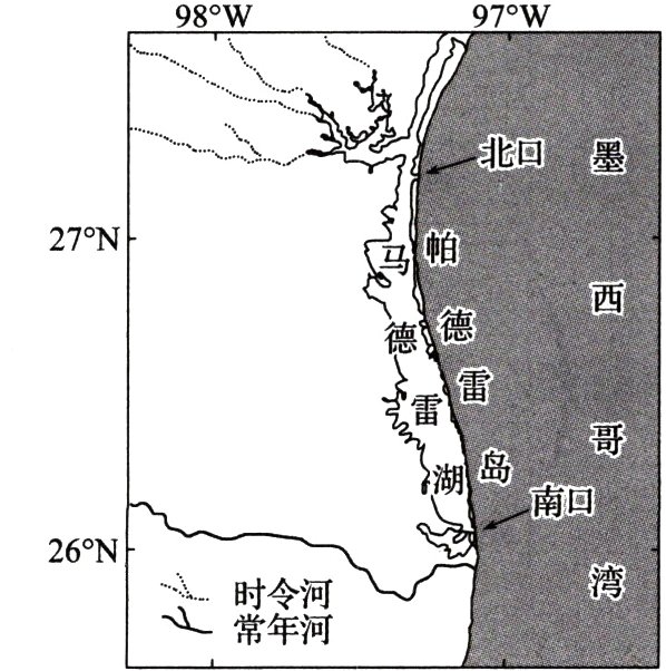 (2)在帕德雷岛南北两侧的水体出入口处,表层水流动方向通常为( )