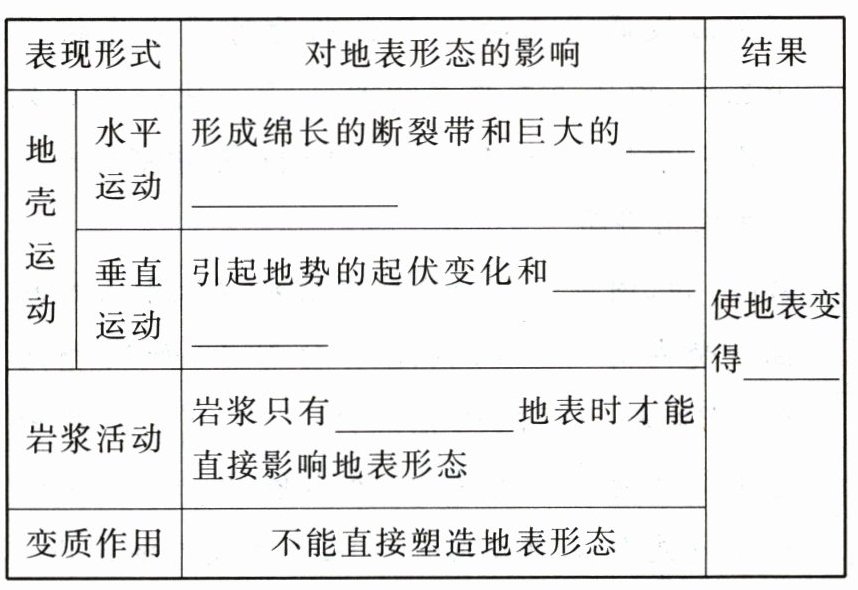 1.(1)热能 (2)褶皱山脉 海陆变迁 喷出 高低不平