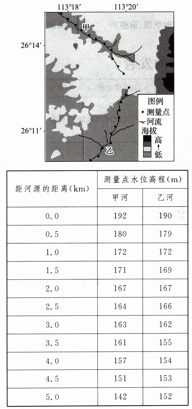 甲河与乙河发源于某山地两侧(如图)。某科研小组调研发现,甲河流经地区的岩石节理发育、压实和成岩作用相对较弱。下表示意两条河流河源段测量点的水位高程。