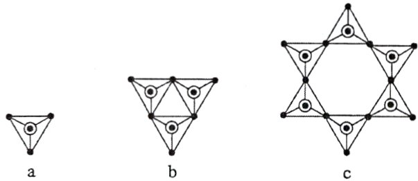 6. 形式多样的硅酸盐是无机矿物的重要基石。SiO₄⁴⁻是一种四面体形的离子(属于硅酸根离子),其结构可用图a表示,硅原子位于该四面体体心,四个氧原子各占一个顶点。图b和图c则是复合硅酸根离子中的两个实例,均为无支链的单环状,分别由数个硅氧四面体a通过共用氧原子的形式构成。