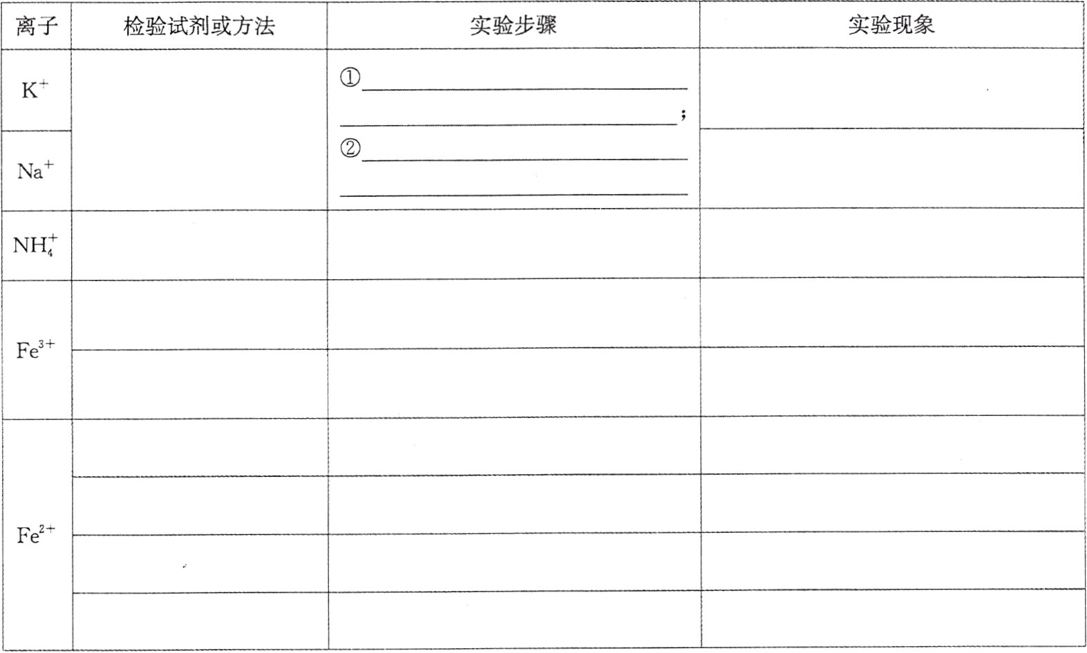 焰色试验 铂丝用盐酸洗涤后在火焰上灼烧至原火焰颜色,蘸取溶液,放在火焰上灼烧,观察火焰颜色。火焰呈紫色(通过蓝色钴玻璃观察),火焰呈黄色。NaOH溶液(浓):取少量待测溶液于试管中,加入NaOH浓溶液并加热,将湿润红色石蕊试纸置于试管口,生成有刺激性气味、能使湿润红色石蕊试纸变蓝的气体。KSCN溶液:取少量待测溶液于试管中,加入KSCN溶液,变为红色溶液。NaOH溶液:取少量待测溶液于试管中,滴加NaOH溶液,产生红褐色沉淀。KSCN溶液、新制的氯水:取少量待测溶液于试管中,先加入KSCN溶液,再加入新制的氯水,加入KSCN溶液不显红色,加入少量新制的氯水后,立即显红色。NaOH溶液:取少量待测溶液于试管中,加入NaOH溶液并露置在空气中,开始时生成白色沉淀,迅速变成灰绿色,最后变成红褐色沉淀。酸性KMnO₄溶液:取少量待测溶液于试管中,加入酸性KMnO₄溶液,溶液紫红色褪去。K₃[Fe(CN)₆]溶液:取少量待测溶液于试管中,加入K₃[Fe(CN)₆]溶液,生成蓝色沉淀。