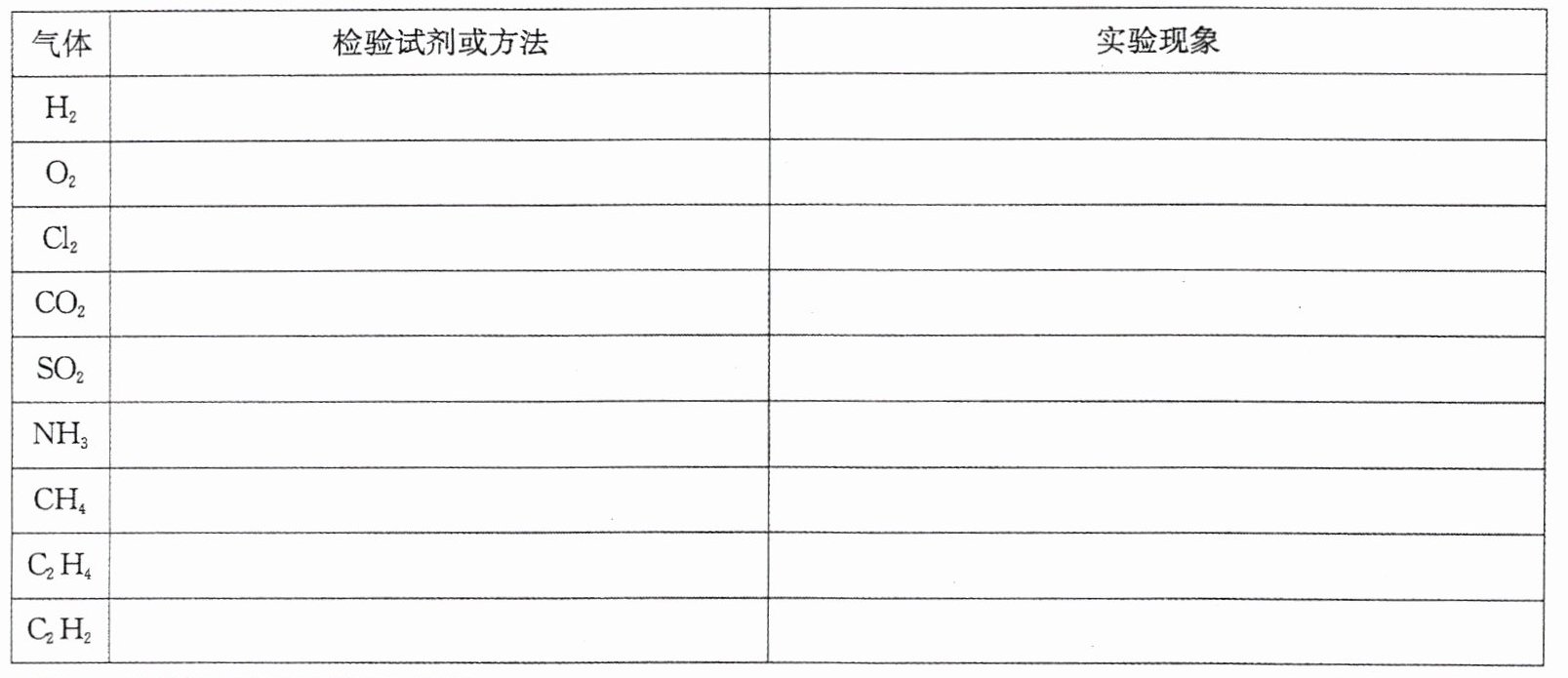 点燃(纯氢):火焰呈浅蓝色,干冷的烧杯罩在火焰上方,烧杯内壁有水雾产生。带火星的木条:木条复燃。湿润的淀粉 - KI试纸:试纸变蓝。通入澄清石灰水中:澄清石灰水变浑浊(通入过量二氧化碳后又变澄清)。通入品红溶液中:品红溶液褪色,加热后又恢复红色。湿润的红色石蕊试纸:试纸变蓝。点燃:火焰呈蓝色,干冷的烧杯罩在火焰上方,烧杯内壁有水雾产生,加澄清石灰水振荡变浑浊。通入溴的四氯化碳溶液(或酸性KMnO₄溶液):溶液褪色。通入溴的四氯化碳溶液(或酸性KMnO₄溶液):溶液褪色。