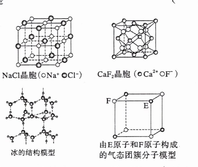 解析:A项,在$NaCl$晶体中,距$Cl^{-}$最近的$Na^{+}$有 6 个,这 6 个$Na^{+}$形成正八面体,A正确;B项,在$CaF_{2}$晶体中,$Ca^{2 + }$位于晶胞的顶点和面心,根据均摊法,每个晶胞平均含有$8\times\frac{1}{8}+6\times\frac{1}{2}=4$个$Ca^{2 + }$,B正确;C项,冰晶体中每个水分子与另外四个水分子形成四面体结构,C正确;D项,该气态团簇分子中含有 E 原子 14 个,F 原子 13 个,所以分子式为$E_{14}F_{13}$,不是 EF,D错误。