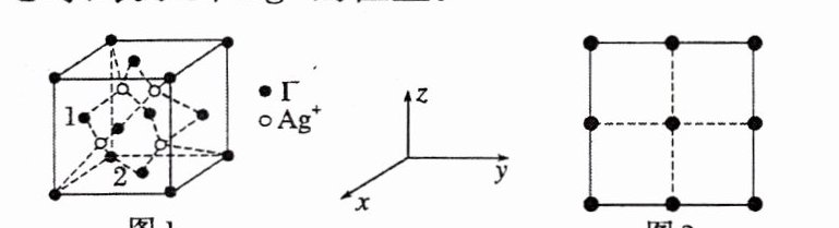 2.(1)AgN₃的晶体结构与AgI相似。AgI的结构分为α - AgI和γ - AgI,γ - AgI立方晶胞的示意图见图1,图2是晶胞正上方的俯视投影图,图中黑球(实心球)表示I⁻,请在图2中用白球(空心球)表示出Ag⁺的位置。