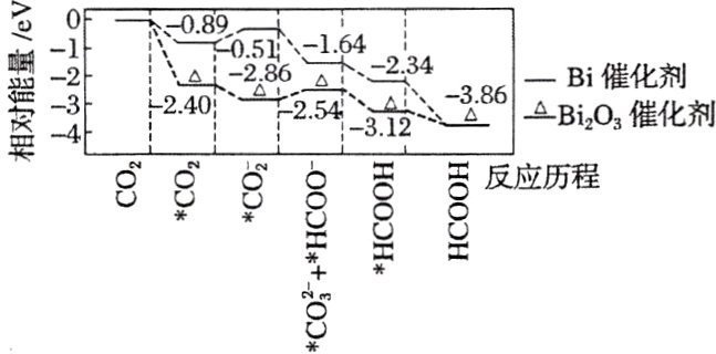 3. 铋基催化剂对CO₂电化学还原制取HCOOH具有高效的选择性。其反应历程与相对能量变化如图所示,其中吸附在催化剂表面上的物种用*标注。