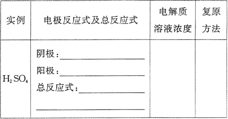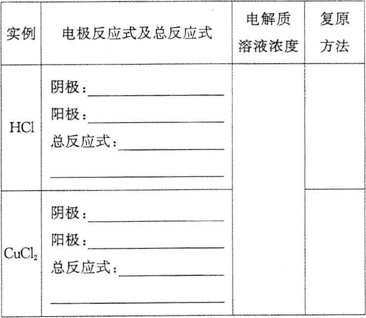 3.(3)①$2H^{+}+2e^{-}=H_{2}\uparrow$ $2H_{2}O - 4e^{-}=4H^{+}+O_{2}\uparrow$ $2H_{2}O\xlongequal{电解}2H_{2}\uparrow +O_{2}\uparrow$ 增大 加水 ②$2H^{+}+2e^{-}=H_{2}\uparrow$ $2Cl^{-}-2e^{-}=Cl_{2}\uparrow$ $2HCl\xlongequal{电解}H_{2}\uparrow +Cl_{2}\uparrow$ $Cu^{2+}+2e^{-}=Cu$ $2Cl^{-}-2e^{-}=Cl_{2}\uparrow$ $CuCl_{2}\xlongequal{电解}Cu + Cl_{2}\uparrow$ 减小 通入 HCl 加$CuCl_{2}$固体 ③$2Cl^{-}-2e^{-}=Cl_{2}\uparrow$ $2H_{2}O + 2e^{-}=H_{2}\uparrow + 2OH^{-}$ $2Cl^{-}+2H_{2}O\xlongequal{电解}Cl_{2}\uparrow + H_{2}\uparrow + 2OH^{-}$ 通入 HCl $2H_{2}O - 4e^{-}=4H^{+}+O_{2}\uparrow$ $Cu^{2+}+2e^{-}=Cu$ $2Cu^{2+}+2H_{2}O\xlongequal{电解}2Cu + O_{2}\uparrow + 4H^{+}$ 减小并生成新电解质 加$CuO$