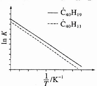 9.[2023·湖北,$19(5)(6)](5)C_{40}H_{19}(g)⇌C_{40}H_{18}(g)+H·(g)$及$\dot{C}_{40}H_{11}(g)⇌C_{40}H_{10}(g)+H·(g)$反应的ln K(K为平衡常数)随温度倒数的关系如图所示。已知本实验条件下,$ln K=-\frac{ΔH}{RT}+c(R$为理想气体常数,c为截距)。图中两条线几乎平行,从结构的角度分析其原因是____________________________。