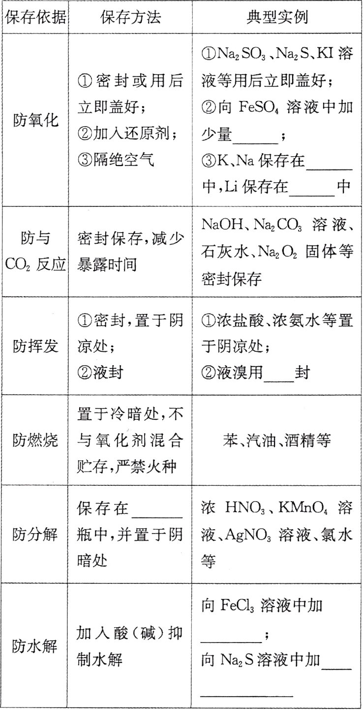 解析:向$FeSO_{4}$溶液中加少量铁屑,是为了防止$Fe^{2 + }$被氧化为$Fe^{3 + }$;$K$、$Na$的密度比煤油大,且不与煤油反应,所以保存在煤油中,$Li$的密度比煤油小,会浮在煤油表面,所以保存在石蜡中;液溴易挥发,用水封可以减少溴的挥发;易分解的试剂保存在棕色瓶中,并置于阴暗处,可防止试剂分解;$FeCl_{3}$溶液中$Fe^{3 + }$易水解,加入稀盐酸可抑制其水解,$Na_{2}S$溶液中$S^{2 - }$易水解,加入$NaOH$溶液可抑制其水解;碱性溶液会与玻璃中的二氧化硅反应,生成具有粘性的硅酸盐,使玻璃塞与试剂瓶粘在一起,所以碱性溶液用橡胶塞。