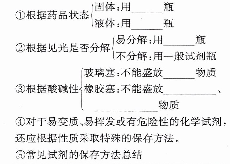 解析:玻璃中的二氧化硅会与碱性物质反应,生成具有粘性的硅酸盐,使玻璃塞与试剂瓶粘在一起,所以玻璃塞不能盛放碱性物质;强酸性和强氧化性物质会腐蚀橡胶塞,所以橡胶塞不能盛放强酸性、强氧化性物质。