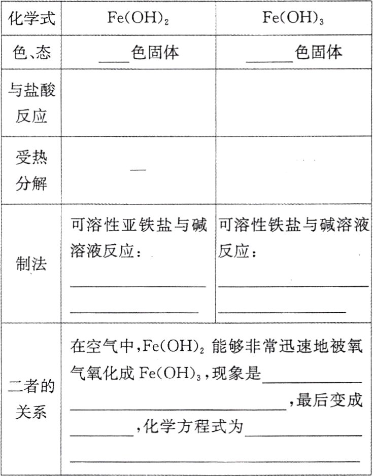 白 红褐 $Fe(OH)_2 + 2H^+ = Fe^{2+} + 2H_2O$ $Fe(OH)_3 + 3H^+ = Fe^{3+} + 3H_2O$ $2Fe(OH)_3 \stackrel{\triangle}{=\!=\!=} Fe_2O_3 + 3H_2O$ $Fe^{2+} + 2OH^- = Fe(OH)_2\downarrow$ $Fe^{3+} + 3OH^- = Fe(OH)_3\downarrow$ 白色絮状沉淀迅速变成灰绿色 红褐色 $4Fe(OH)_2 + O_2 + 2H_2O = 4Fe(OH)_3$