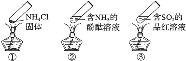 解析:A项,加热时,$NH_{4}Cl$分解为$NH_{3}$和$HCl$,在试管上部温度降低,$NH_{3}$和$HCl$又重新化合生成$NH_{4}Cl$固体,所以试管上部汇集了固体,A正确;B项,加热时,氨气逸出,溶液碱性减弱,溶液由红色变为无色,冷却后氨气又溶于水,溶液又变红,B错误;C项,加热时,氨气逸出,溶液碱性减弱,溶液红色褪去,冷却后氨气又溶于水,溶液又变红,C错误;D项,可逆反应是在同一条件下既能向正反应方向进行,又能向逆反应方向进行的反应,①中$NH_{4}Cl$分解和化合的条件不同,不是可逆反应,D错误。