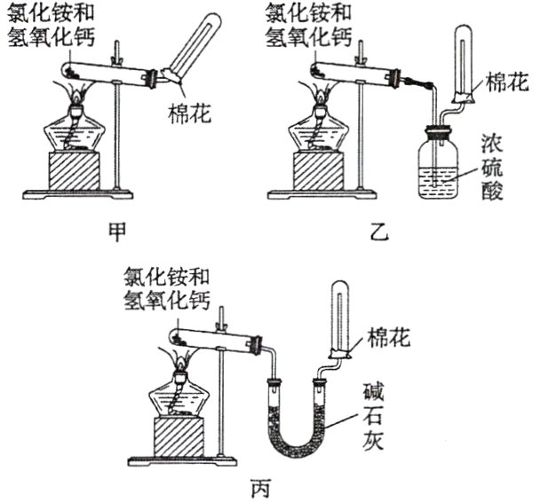 (2)甲装置中,氯化铵分解产生的氨气和氯化氢在试管口又会重新化合生成氯化铵,不能得到氨气;乙装置中,氨气会与浓硫酸反应,不能收集到氨气;丙装置中,用氢氧化钙和氯化铵反应制取氨气,用碱石灰干燥氨气,装置和所用样品都正确。