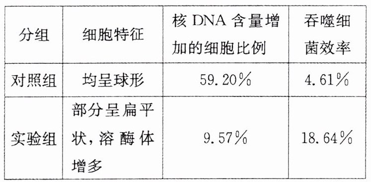 1.C [细胞的形态变化是基因的选择性表达,遗传物质没有发生改变,A错误;由表格信息可知,核DNA含量增加的细胞比例为9.57%,核DNA含量增加的时期包括G₂期和分裂期,B错误;吞噬细胞中的溶酶体释放消化酶,可分解进入细胞的细菌,因此吞噬细菌效率的提高与吞噬细胞中溶酶体增多有关,C正确;去除该化合物后扁平状细胞不再分裂分化,扁平状细胞不会恢复成球形,D错误。]