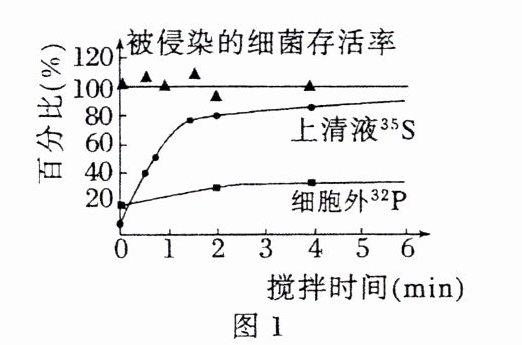 (3)图1中被侵染的细菌的存活率基本保持在100%,本组数据意义是__________________________。细胞外的³²P含量有30%,原因是______________________________。上清液中的³⁵S先增大后保持在80%左右,原因是__________________________。