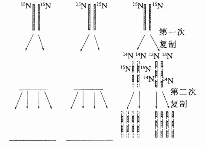 ①图示分析:若亲代DNA分子完全被¹⁵N标记,请分别按照半保留复制、全保留复制和弥散型复制的假说,分析绘制¹⁵N标记的亲代DNA分子在含有¹⁴N的环境中连续复制所得子一代和子二代的DNA分子中的¹⁵N和¹⁴N的分布状态,实线表示¹⁵N标记,虚线部分表示¹⁴N标记。