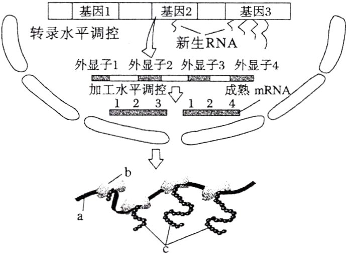 2.如图是真核细胞内基因表达的示意图。图中一个基因可由若干个外显子与内含子组成,基因被转录后经拼接加工把内含子转录出的片段切除,就形成了成熟mRNA。则: