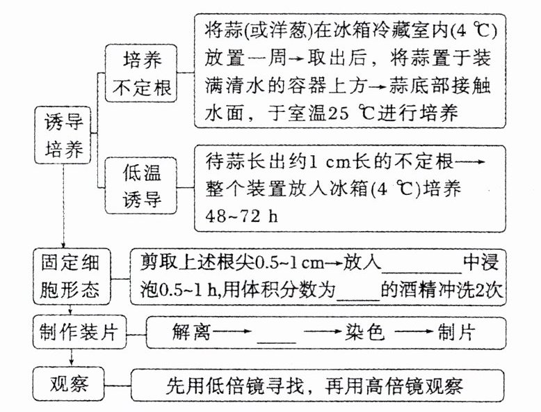 (6)× [使用卡诺氏液的目的是固定细胞形态;解离液使组织细胞彼此分离开。]