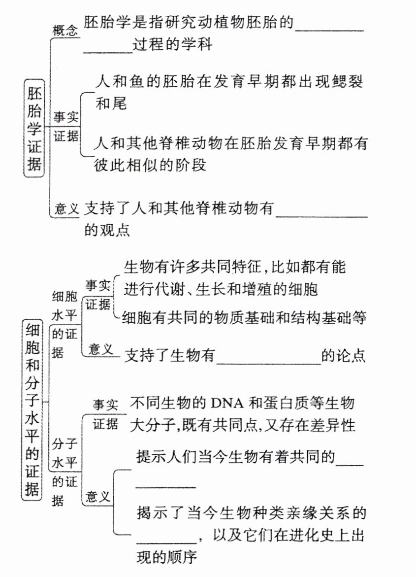 (2)过度繁殖 遗传变异 可遗传的变异 自然选择 可遗传的有利变异 环境的定向选择 统一性 共同 多样性 适应性 性状