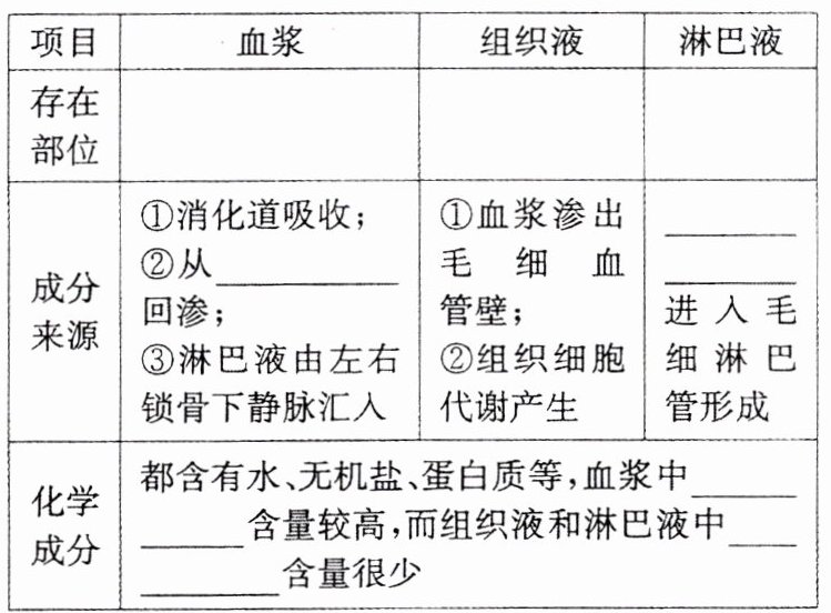 (2)三种细胞外液组成成分的比较