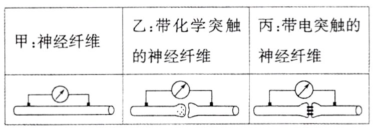 6. 根据神经冲动通过突触方式的不同,可将突触分为化学突触和电突触,化学突触通过神经递质传递信息,电突触以通道连接在细胞之间(突触两侧由于电位差的存在可以发生电荷移动)传递信息。为了解兴奋传导或传递的情况,某小组用神经纤维、带化学突触(释放兴奋性神经递质)的神经纤维、带电突触的神经纤维和电表进行了如下实验。下列分析错误的是 ( )