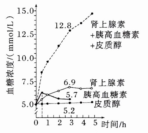 3.(2022·海南,14)机体内血糖浓度受多种激素共同调节。某实验小组探究了三种激素单独或联合作用调节血糖的效应,实验前血糖浓度为5.0mmol/L,血糖浓度随激素处理时间的变化如图。下列有关叙述正确的是 ( )
