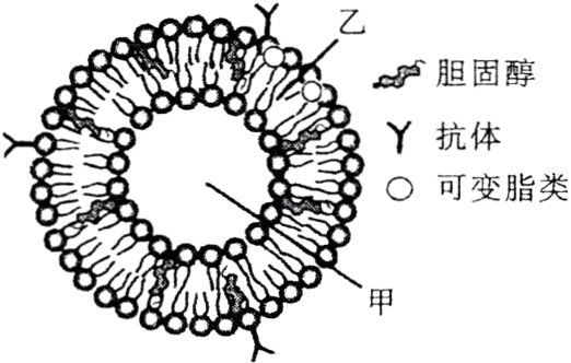 (1)甲处、乙处 两层磷脂分子之间是疏水的,脂溶性药物能被稳定地包裹在其中;脂质体内部是水溶液,在水中结晶的药物能被稳定地包裹在其中