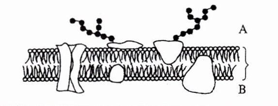 A→B 糖被的位置,在细胞膜的外侧分布有糖蛋白或糖脂,而内侧没有