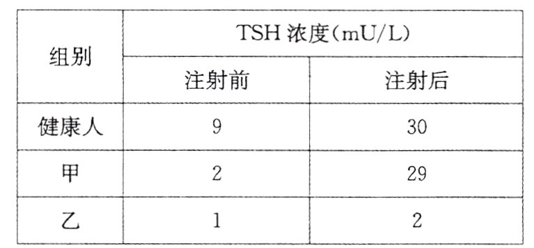 (2)甲发生病变的部位可能是下丘脑,TRH是下丘脑分泌的,当注射适量的TRH后,垂体分泌的TSH水平恢复至接近正常,表明垂体是正常的。乙发生病变的部位可能是垂体,因为适量注射TRH后,垂体分泌的TSH水平并未明显恢复。