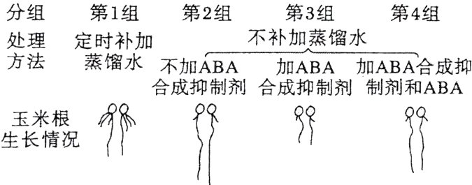 5.C [ABA是脱落酸,ABA合成抑制剂可以抑制ABA的合成,据题图可知,第2组不加入ABA合成抑制剂,则两组的自变量为蒸馏水的有无(是否干旱),第2组玉米主根的长度大于第1组,但侧根数量少于第1组,说明干旱处理可以促进主根长度增加,但抑制侧根生长,A错误;第2组不加ABA合成抑制剂,第3组加入ABA合成抑制剂(ABA不能正常合成),两组的自变量为ABA的有无,实验结果是第3组的主根长度小于第2组,说明缺少ABA时主根生长变慢,B错误;本实验的目的是研究脱落酸(ABA)在植物抗旱中的作用,则实验的自变量为是否干旱和脱落酸的有无,可通过补加蒸馏水及添加ABA合成抑制剂来控制,C正确;第4组是同时添加ABA合成抑制剂和ABA,可以与第2组和第3组形成对照,实验结果是该组的主根长度小于第2组,但大于第3组,说明ABA合成抑制剂可以减缓ABA在干旱条件下促进主根生长的作用,D错误。]
