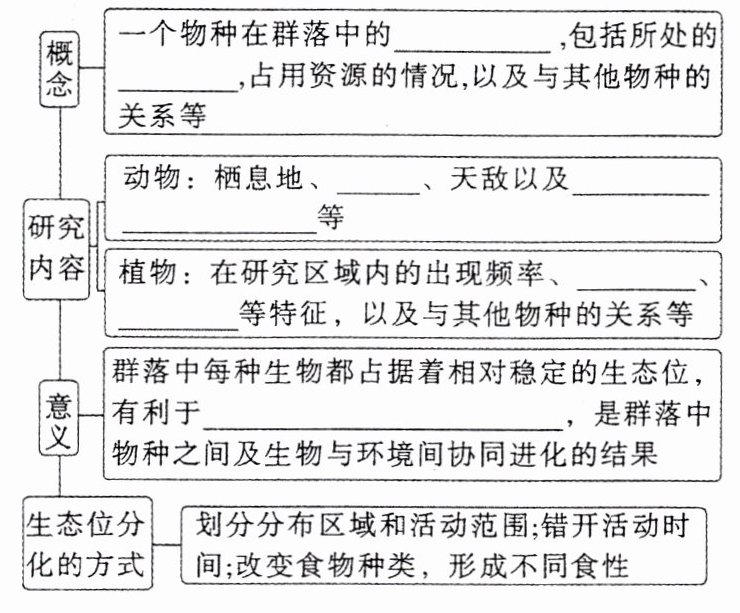 地位或作用 空间位置 食物 与其他物种的关系 种群密度 植株高度 不同生物充分利用环境资源