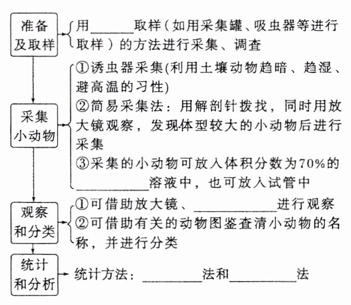 ③使用无底花盆是为了提供通气环境,便于小动物向下移动。使用体积分数为70%的酒精溶液,既可以杀死小动物,也利于保存小动物。