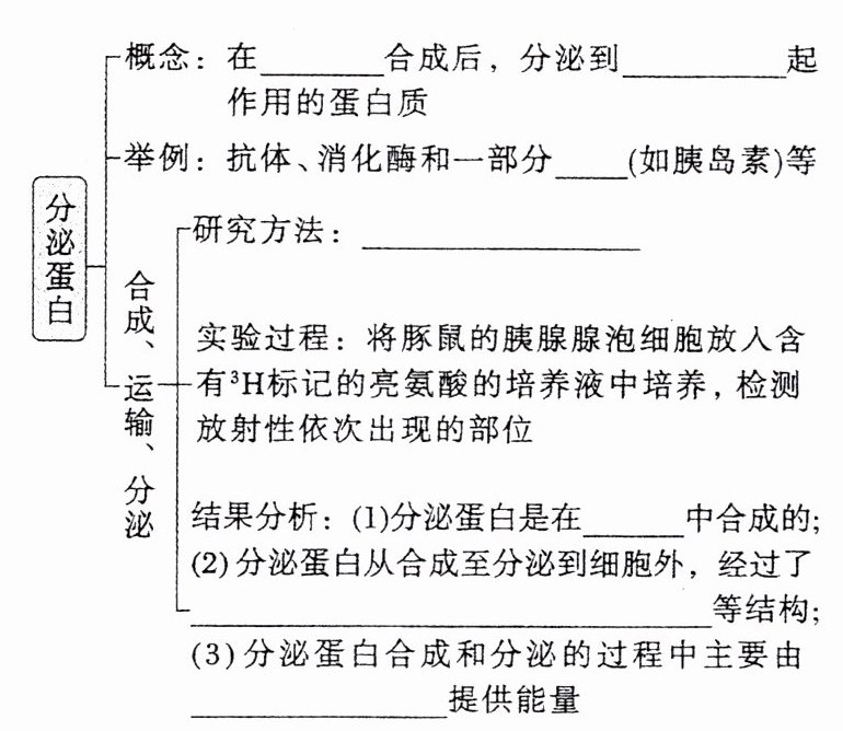 根据教材$P_{51}$“分泌蛋白的合成和运输”的实验结果,用箭头和文字画出分泌蛋白合成、运输、分泌途径示意图,并用关键词(教材$P_{52}$)描述各细胞结构在此过程中的作用。