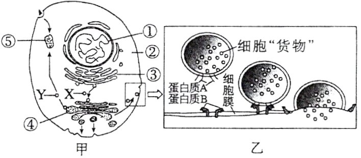(1)研究表明,图甲中的Y囊泡内的“货物”为多种水解酶,这些酶会储存在结构⑤中,推断结构⑤是__________,由内质网、高尔基体加工的蛋白质不一定是分泌蛋白,如____________________。