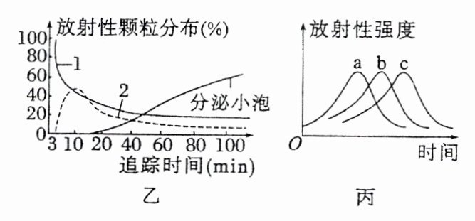 4.图甲表示分泌蛋白合成及分泌过程中膜面积的变化;图乙表示放射性颗粒在不同结构出现的先后顺序;图丙表示不同细胞器中放射性强度的变化。据图分析,图甲中A、B、C三条曲线所指代的膜结构分别是____________________;图乙中1、2所指代的细胞器是____________________;图丙中a、b、c所代表的细胞器分别为____________________。