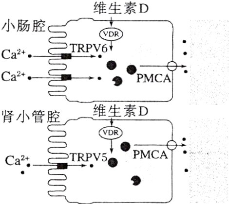 14.Ca²⁺参与神经冲动的传递、肌肉细胞的收缩等多种生理过程,血液中Ca²⁺浓度稳态的维持具有重要意义。如图为维生素D促进血液中Ca²⁺浓度升高的示意图,TRPV5、TRPV6为Ca²⁺通道转运蛋白,PMCA为Ca²⁺载体转运蛋白。下列相关叙述不正确的是( )