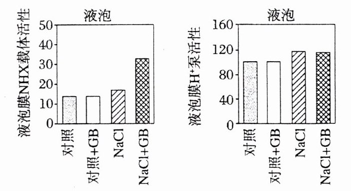 6. A [溶质的跨膜转运不一定都会引起细胞膜两侧的渗透压变化,如正常细胞为维持渗透压一直在进行的跨膜转运,再如单细胞生物在跨膜转运时,细胞外侧渗透压几乎很难改变,A错误;对比分析上两个题图可知,NaCl胁迫时,加GB使Na⁺外排显著增加,钒酸钠处理抑制了质膜H⁺泵后,NaCl胁迫时,加GB使Na⁺外排略微增加,说明GB可能通过调控质膜H⁺泵活性来增强Na⁺外排,从而减少细胞内Na⁺的积累,B正确;对比分析下两个题图可知,NaCl胁迫时,加GB使液泡膜NHX载体活性明显增强,而液泡膜H⁺泵活性几乎无变化,所以GB引起盐胁迫下液泡中Na⁺浓度的显著变化,与液泡膜NHX载体活性有关,而与液泡膜H⁺泵活性无关,C正确;由题意可知,植物通过质膜H⁺泵把Na⁺排出细胞,也可通过液泡膜NHX载体和液泡膜H⁺泵把Na⁺转入液泡内,以维持细胞质基质Na⁺稳态,增强植物的耐盐性,D正确。]