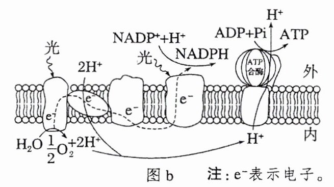 (1)图b表示图a中的__________结构,膜上发生的光反应过程将水分解成O₂、H⁺和e⁻,光能转化成电能,最终转化为__________和ATP中活跃的化学能。若CO₂浓度降低,暗反应速率减慢,叶绿体中电子受体NADP⁺减少,则图b中电子传递速率会__________(填“加快”或“减慢”)。