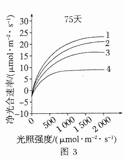 (3)据图3可见,O₃处理75天后,曲线3净光合速率小于曲线1、曲线4净光合速率小于曲线2,即甲、乙两种植物的实验组的净光合速率均明显小于对照组,表明长时间高浓度的O₃对植物光合作用产生明显抑制;曲线4净光合速率比曲线3下降更大,即长时间高浓度O₃对乙植物的影响大于甲植物,表明长时间高浓度O₃对不同种类植物光合作用产生的抑制效果有差异。