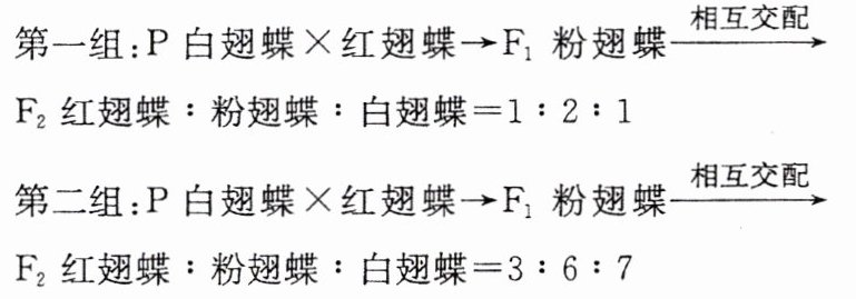 2.D [红色翅膀蝴蝶对应的基因型为$A_bb,$粉色翅膀蝴蝶对应的基因型为$A_Bb,$白色翅膀蝴蝶对应的基因型为$A_BB、$$aaB_、$aabb;第二组实验中的F₂出现了3∶6∶7的比例,为9∶3∶3∶1的变式,故A/a和B/b这两对等位基因的遗传遵循自由组合定律,结合第一组实验的杂交情况可推知亲本基因型为AABB(白翅蝶)×AAbb(红翅蝶),F₁的基因型为AABb,F₂的基因型及比例为1/4AABB、2/4AABb、1/4AAbb,故在第一组中,F₂中纯合子所占的比例为1/2,A、B正确;结合A项的分析,可推知第二组中F₁的基因型为AaBb,亲本的基因型为aaBB×AAbb,F₂中对应的基因型及比例为1/16AABB、4/16AaBb、2/16AaBB、2/16AABb、1/16AAbb、2/16AaBb、1/16aaBB、2/16aaBb、1/16aabb,故在第二组中,F₂白翅蝶(1/16AABB、2/16AaBB、1/16aaBB、2/16aaBb、1/16aabb)中纯合子的比例为3/7,C正确;结合C项的分析,第二组中F₁的基因型为AaBb,若进行测交(与aabb杂交),子代基因型及比例为1/4AaBb、1/4Aabb、1/4aaBb、1/4aabb,则子代中粉翅蝶的比例为1/4,D错误。]