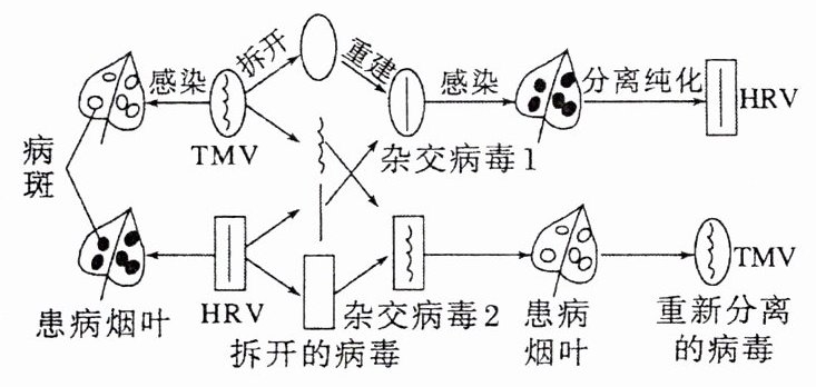 11.已知烟草花叶病毒(TMV)和车前草病毒(HRV)都能侵染烟草叶片,且两者都由蛋白质和RNA组成。如图是探索HRV的遗传物质是蛋白质还是RNA的操作流程图。据图分析,下列叙述正确的是 ( )