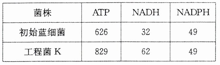 (3)蓝细菌还存在一种只产生ATP不参与水光解的光合作用途径。研究者构建了该途径被强化的工程菌K,以补充ATP产量,使更多NADH用于生成D-乳酸。测定初始蓝细菌、工程菌K中细胞质ATP、NADH和NADPH含量,结果如表。