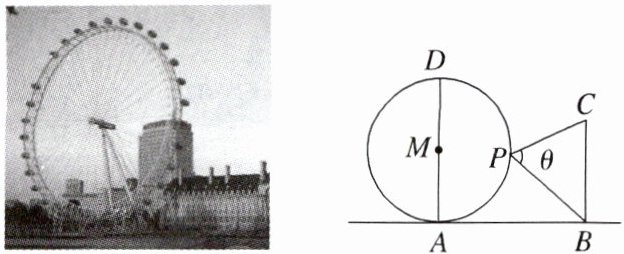 (2) “伦敦眼”坐落在英国伦敦泰晤士河畔,是世界上首座观景摩天轮,又称“千禧之轮”,该摩天轮的半径为6(单位:10 m),游客在乘坐舱P升到上半空鸟瞰伦敦建筑BC,伦敦眼与建筑之间的距离AB为12(单位:10 m),游客在乘坐舱P看建筑BC的视角为θ. 当乘坐舱P在伦敦眼的最高点D时,视角θ = 30°,则建筑BC的高度为______________.(单位:10 m)