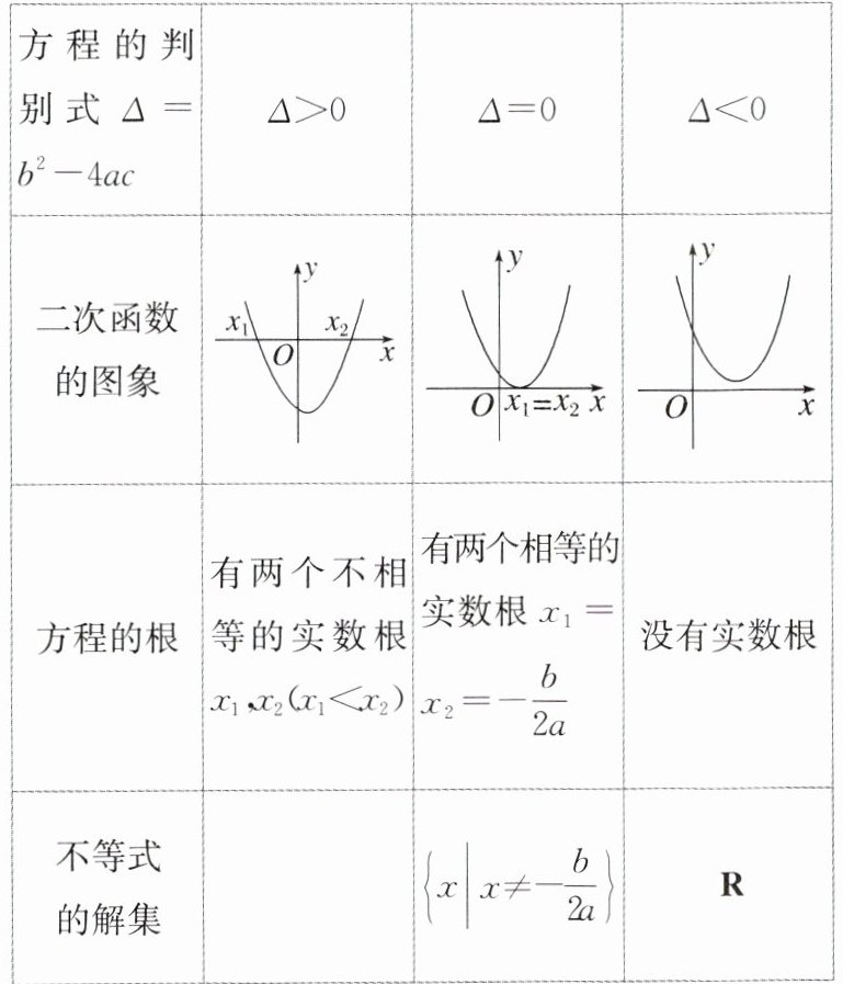 1. 二次函数$y = ax^{2}+bx + c(a>0)$与一元二次方程$ax^{2}+bx + c = 0(a>0)$,不等式$ax^{2}+bx + c>0(a>0)$的解的对应关系