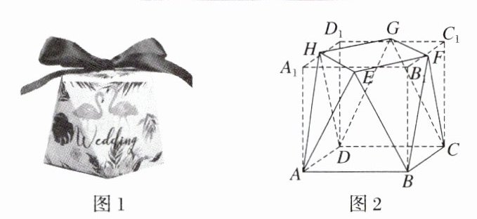 例2 数学中有许多形状优美、寓意独特的几何体,图1所示的礼品包装盒就是其中之一.该礼品包装盒可以看成是一个十面体,其中上、下底面为全等的正方形,所有的侧面是全等的等腰三角形.将长方体ABCD - A₁B₁C₁D₁的上底面A₁B₁C₁D₁绕着其中心旋转45°得到如图2所示的十面体ABCD - EFGH.已知AB = AD = 2,AE = $\sqrt{7}$,则十面体ABCD - EFGH外接球的表面积是______________.