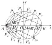例2 已知椭圆$C:\frac{x^{2}}{2}+y^{2}=1$的左、右两个顶点分别为$A$,$B$,点$M_1$,$M_2$,$\cdots$,$M_5$是$AB$的六等分点,分别过这五点作斜率为$k$($k\neq0$)的一组平行线,交椭圆$C$于$P_1$,$P_2$,$\cdots$,$P_{10}$,则直线$AP_1$,$AP_2$,$\cdots$,$AP_{10}$,这10条直线的斜率乘积为( )