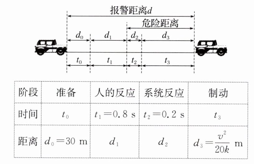 例3(2024·文山模拟)汽车智能辅助驾驶已开始得到应用,其自动刹车的工作原理是用雷达测出车辆与前方障碍物之间的距离,当此距离等于报警距离时就开启报警提醒,等于危险距离时就自动刹车. 某种算法将报警时间分为4段(如图所示),分别为准备时间$t_{0}$、人的反应时间$t_{1}$、系统反应时间$t_{2}$、制动时间$t_{3}$,相应的距离分别为$d_{0},d_{1},d_{2},d_{3}$,当车速为$v$(单位:$\text{m}/\text{s}$),且$0\leqslant v\leqslant33.3$时,通过大数据统计分析得到下表(其中系数$k$随地面湿滑程度等路面情况而变化,且$0.5\leqslant k\leqslant0.9$).