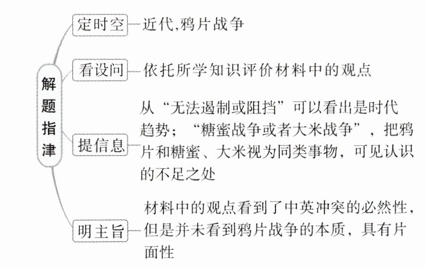 典例 (2023·北京卷,6)关于鸦片战争,有人认为,“自由贸易者背后的经济能力极其强大,无法遏制或阻挡”“如果在鸦片之外还有其他好的选择,比如说糖蜜或者大米,这场冲突就可能被称为糖蜜战争或者大米战争”。对于上述观点,认识正确的是 ( )