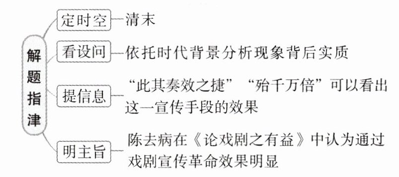 典例 (2023·全国甲卷,28)清末,陈去病在《论戏剧之有益》一文中说:“此其奏效之捷,必有过于劳心焦思,孜孜矻矻以作《革命军》《驳康书》《黄帝魂》《落花梦》《自由血》者殆千万倍。”他号召青年人投身戏剧。这反映出 ( )