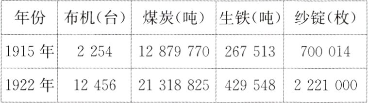 下表是中国1915年和1922年民族工业发展基本状况,结合所学可知这一时期( )